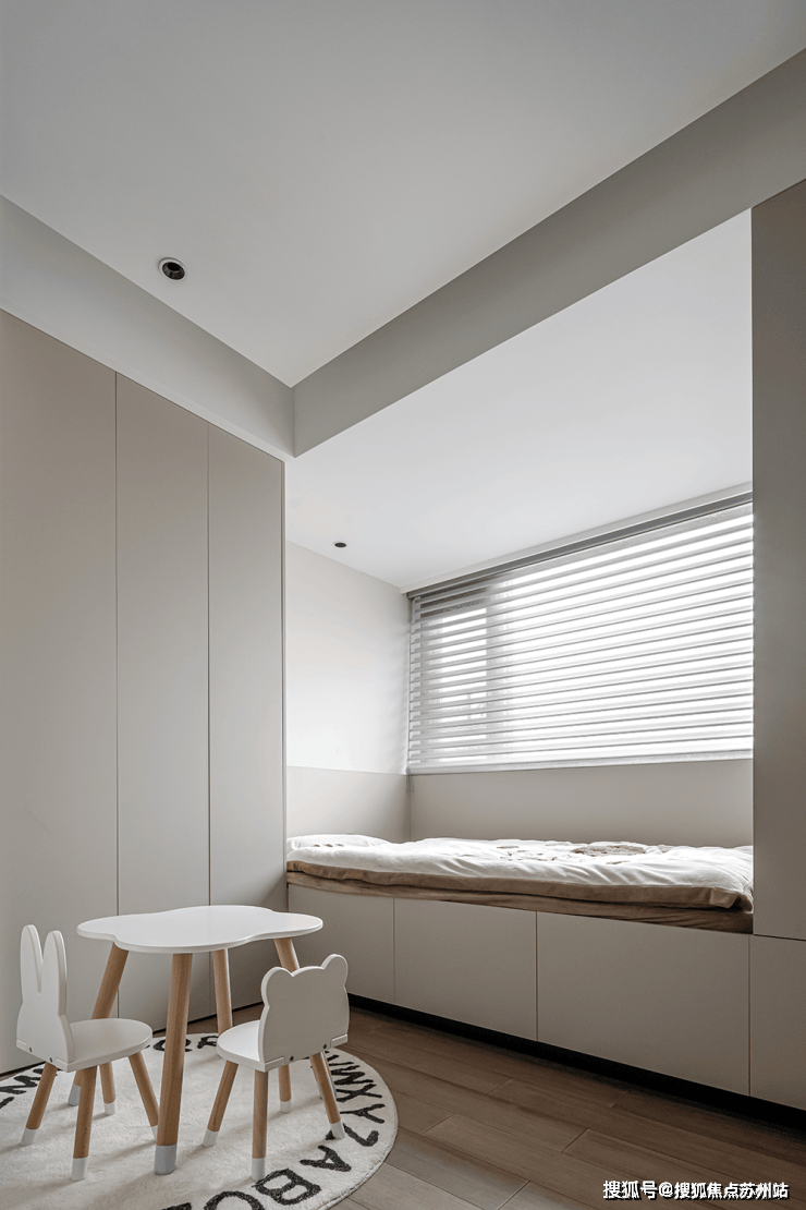 次卧空间虽然不大,但内嵌式的整体衣柜设计彰显出一种高贵典雅的气质,精致而不失实用,而卡通造型的桌椅则为孩子们带来了无尽的乐趣与惊喜,让他们的童年充满了温馨与快乐。