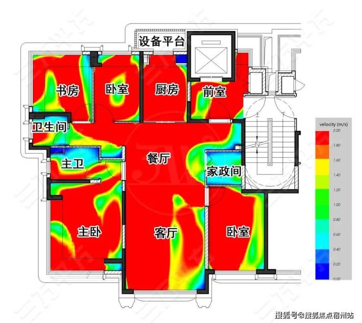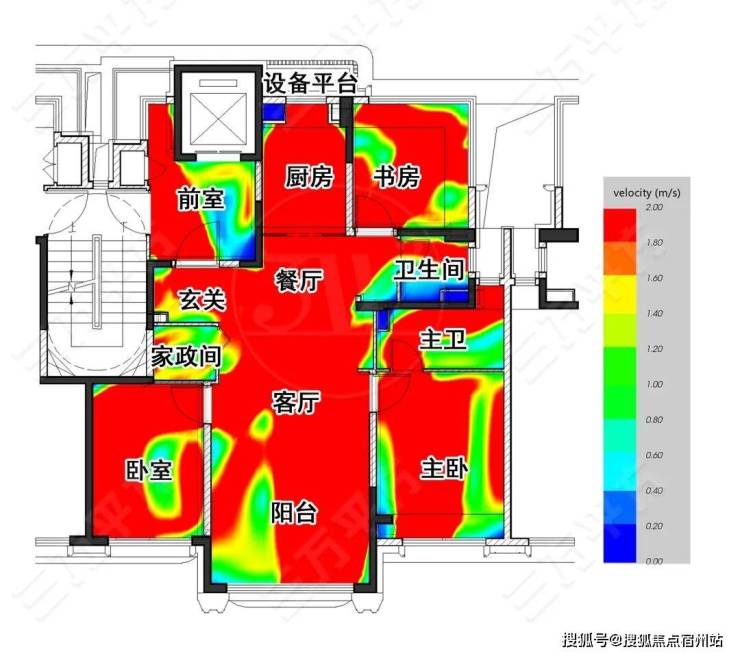 如下图,图上模拟计算的是在春夏季东南风环境下,户内的通风情况.能够正常的看到,大部分房间都有最好的通风条件.