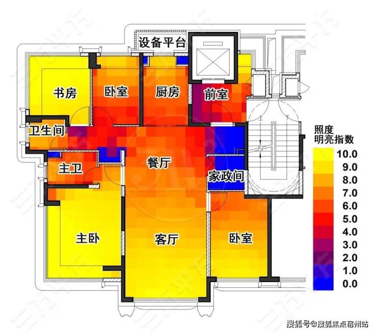 下图为采光测算,照度明亮指数反映了该区域采光条件的好坏.图中黄色代表采光最好的的高照度区,临近窗户处,在白天拥有明亮采光.蓝照度最差,通常位于走道、玄关等空间,因远离窗户或受墙体遮挡,自然光线难以充分进入,照度低.若用于阅读、精细作业等场景,可能因光线不足导致视觉压力上海保利外滩曜售楼处电话☎:【已认证】,需依赖人工照明补充.