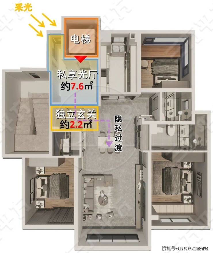 本户型为一梯一户设计,配备约7.6㎡私享光厅(同面积段仅3-5㎡,且为暗厅),作为入户过渡空间,既规避传统楼栋入户昏暗、拥挤等问题,又可承载收纳或迎宾等缓冲功能,兼顾仪式感与实用性;约2.2㎡独立入户玄关可定制顶天立地收纳柜,实现鞋靴、外套等物品有序归置,同时形成“入户-客厅”的隐私过渡,维持室内整洁度.