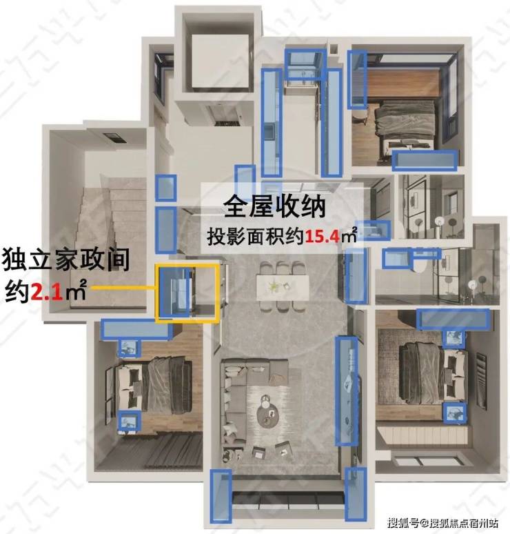 本户型全屋收纳空间顶面投影面积达到了约15.4㎡,覆盖玄关柜、客厅储物柜、卧室衣柜等多元场景.
