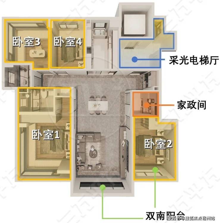 更关键的是,约2.1㎡独立家政间为同面积段罕见配置(一般140㎡以上户型才有配备),除放置洗烘套件外,还可集中收纳清洁工具、日常物品等.系统化的收纳设计与公共空间、卧室功能形成互补,确保居家环境整洁有序.