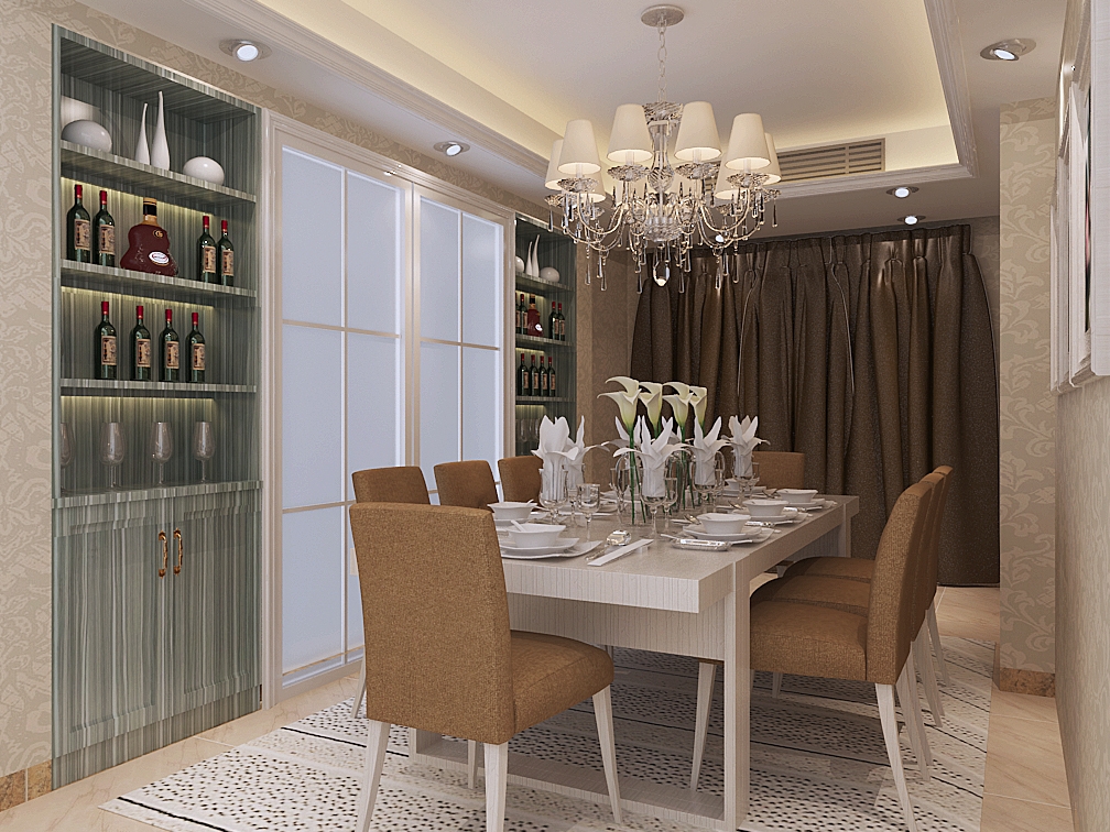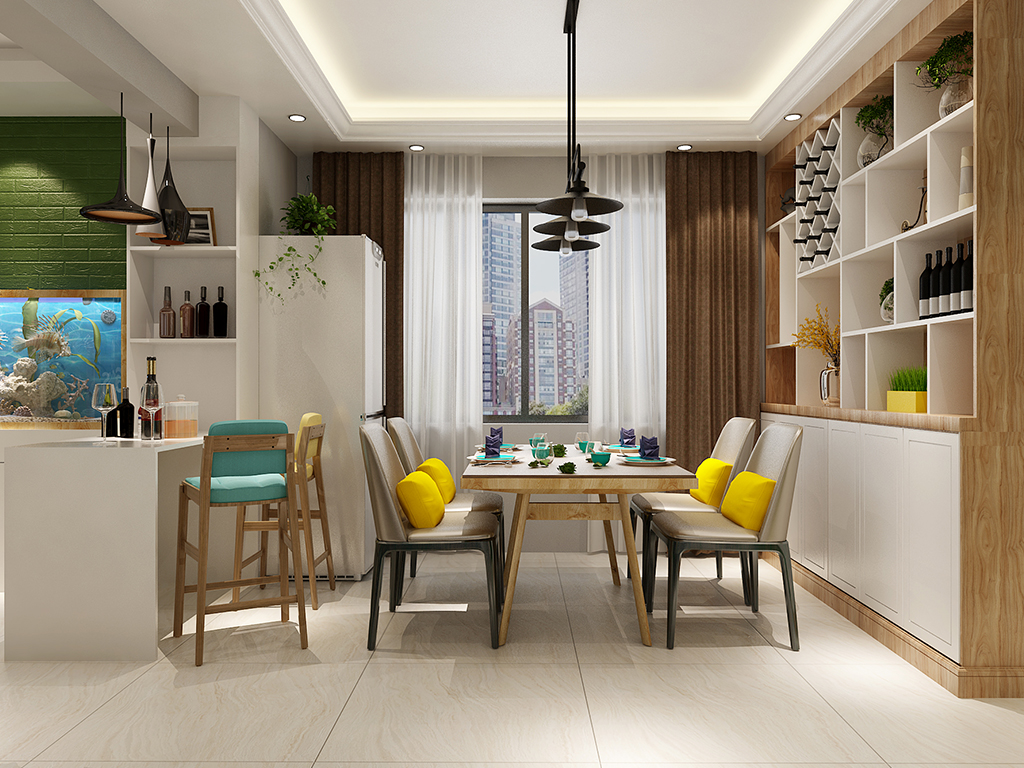餐厅酒柜与墙体完美交融,柜体上部敞开格和菱形格规划,便利红酒的保藏和饰品的展现;柜体下部选用封闭式规划,一些无处摆放的杂物可以收纳在此,坚持了家居的洁净与漂亮。