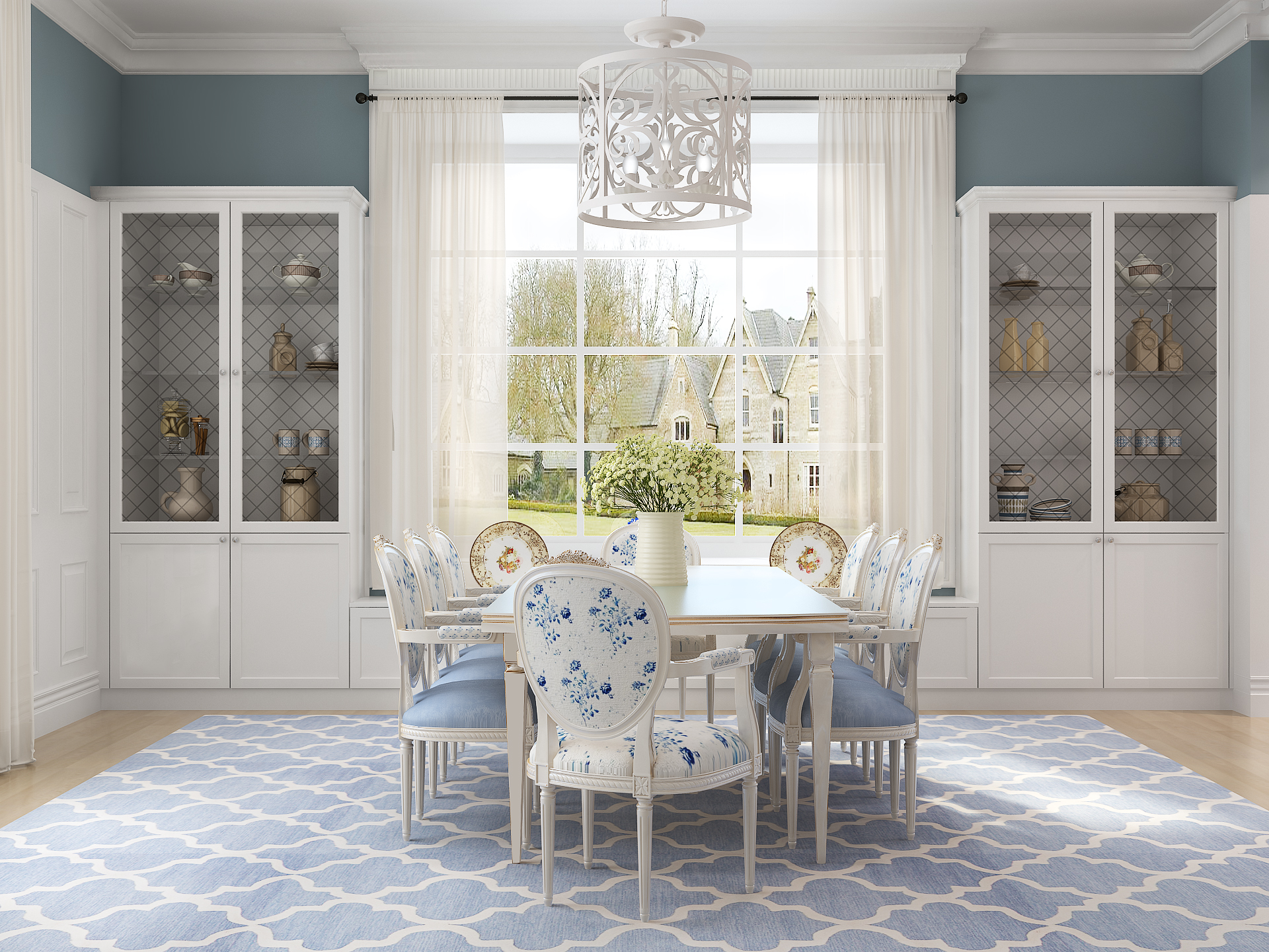 欧式风格的餐厅以白色和浅蓝色为主,整个用餐空间显得高雅、安静和浪漫。酒柜餐边柜根据飘窗空间进行对称规划,玻璃门板漂亮漂亮,让人一望而知;中心的矮柜榻榻米便利歇息,也可储物。