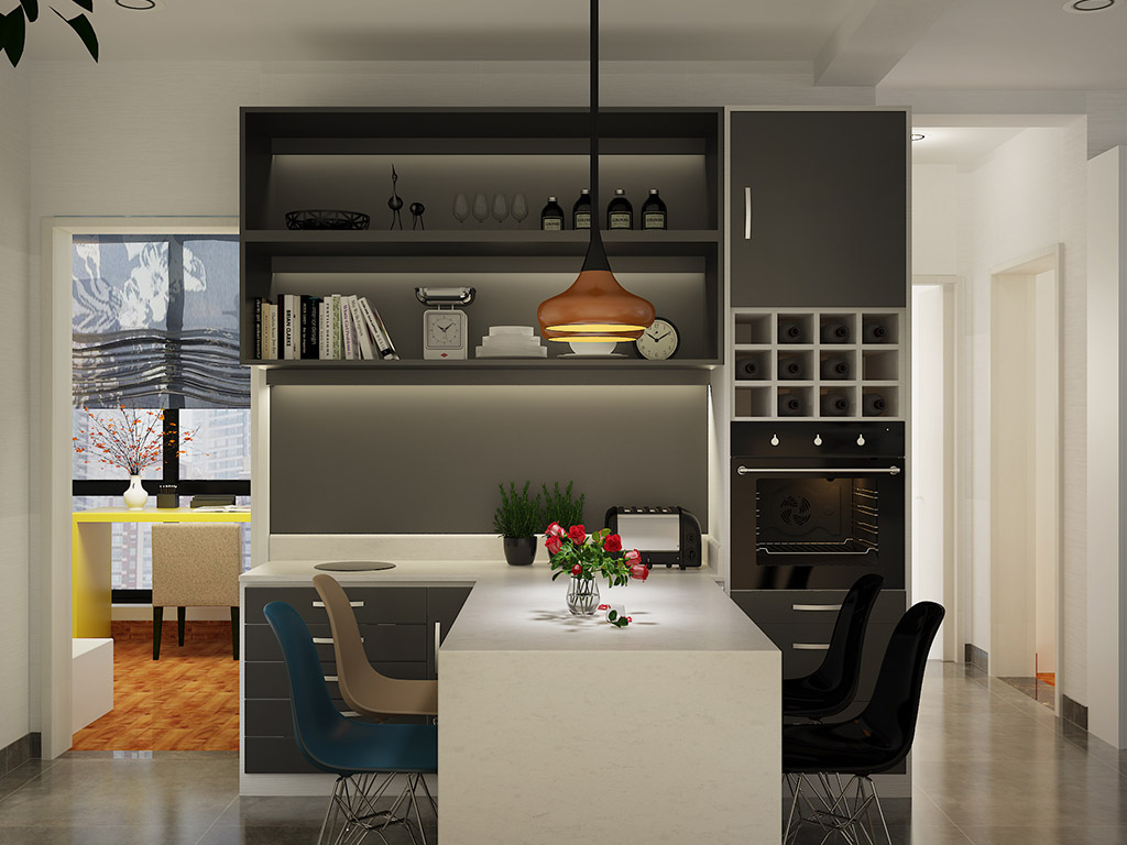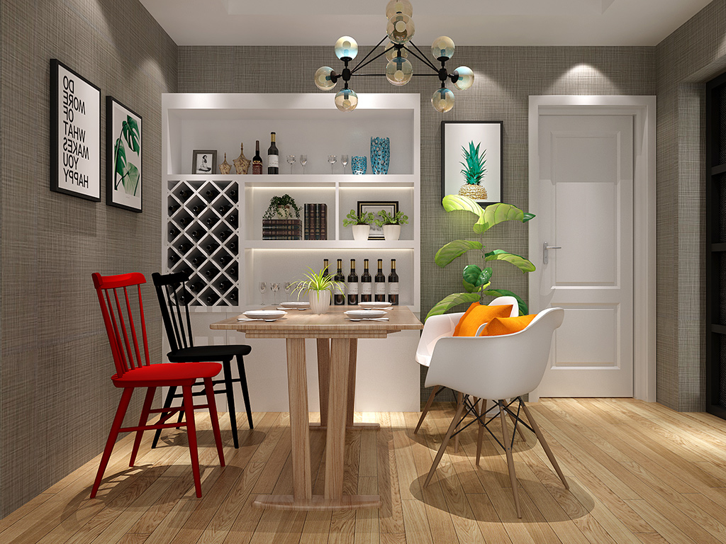 餐厅选用简略的色彩进行装修,灰色墙纸调配白色酒柜,在原木色餐桌及地板的中和下,显得温馨而舒适,黑赤色的餐椅活泼了气氛。半敞开式酒柜可藏酒、可展现、可储物,造型简练,功用丰厚。