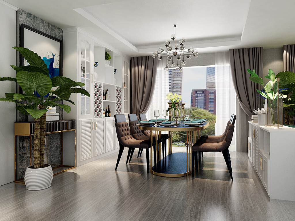 白色酒柜与金属原料的餐桌椅调配,色彩高雅,外形精美,尽显欧式风格的高端与大气。酒柜集储物、展现及装修于一身,玻璃门板和百叶门版组合,彰显出高雅浪漫的气质。